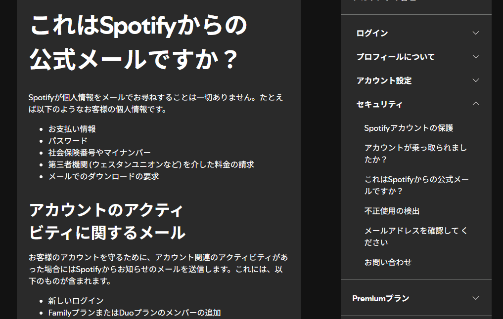 - メールやSMSでパスワードやカード番号を直接入力させることはSpotifyはしない