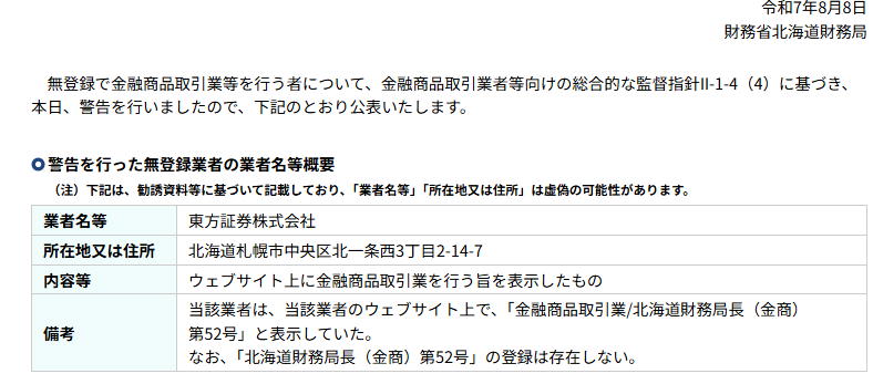 2025年8月8日、北海道財務局は東方証券株式会社に対して「無登録で金融商品取引業を行っている」との警告を公式に発表しました。